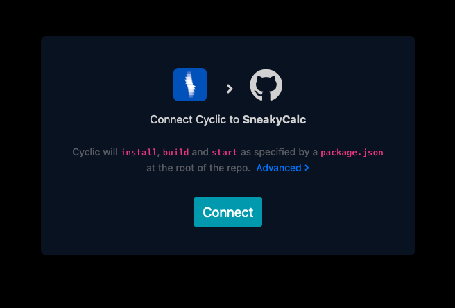 We'll hit the Connect button now and BINGO! That calculatin' static site is 🎉live🎉 and hosted on Cyclic.