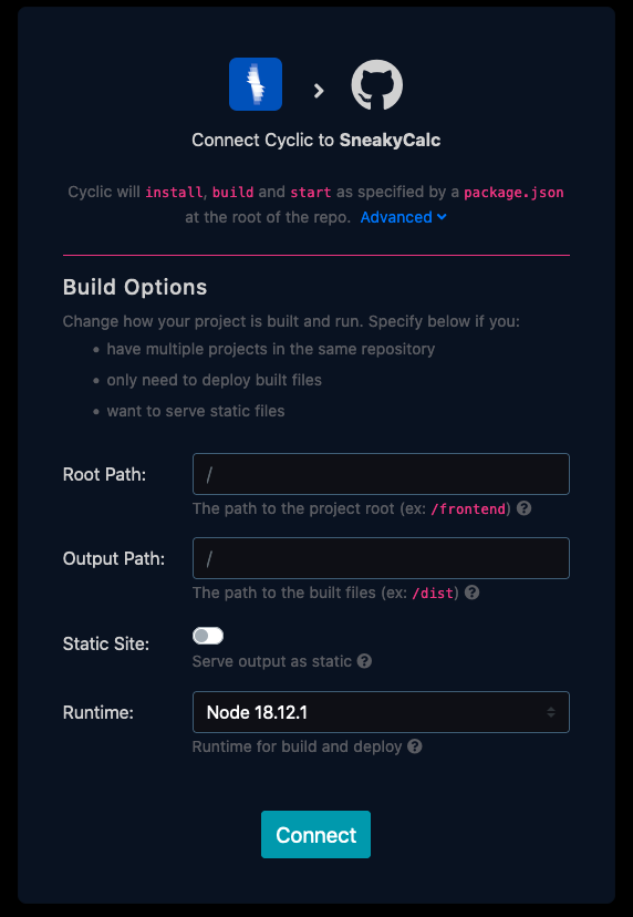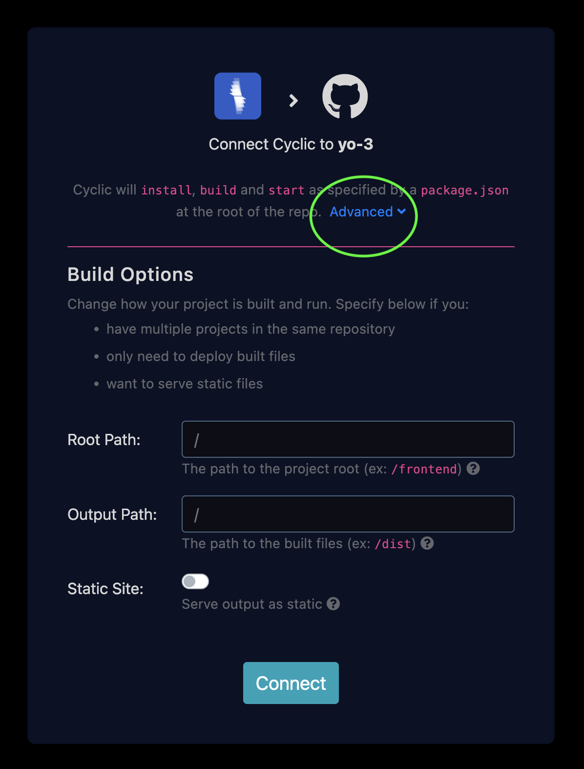 The final piece of setup is to add the start script ”start”: node index.js to scripts in our brand new package.json file. Cyclic specifically looks for the node start script to give us access to the screen with the ✨Advanced Build Options✨.